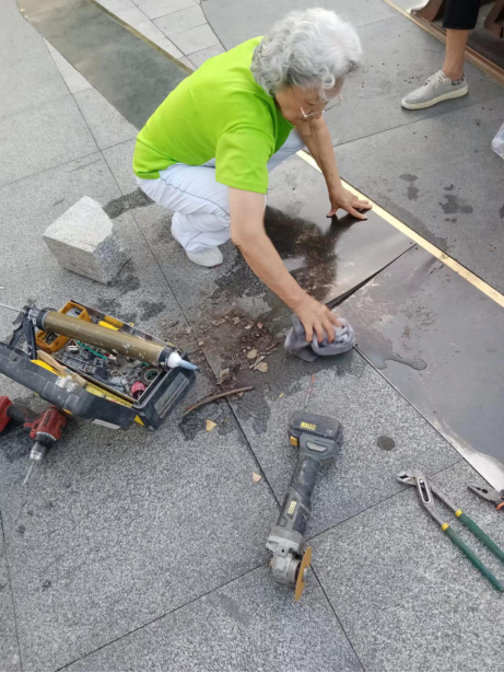 “这处翘边要是不处理,老人孩子走路太危险了。”老党员张大叔抹了把汗,他的老搭档金阿姨已经利索地掏出随身携带的螺丝刀。维修过程中,60多岁的徐师傅主动加入,他从事装修行业多年,经验丰富,成了队伍里的“技术担当”。从清理破损部件、调配粘贴材料到加固松动结构,几位志愿者分工协作,汗水侵透了衣衫。