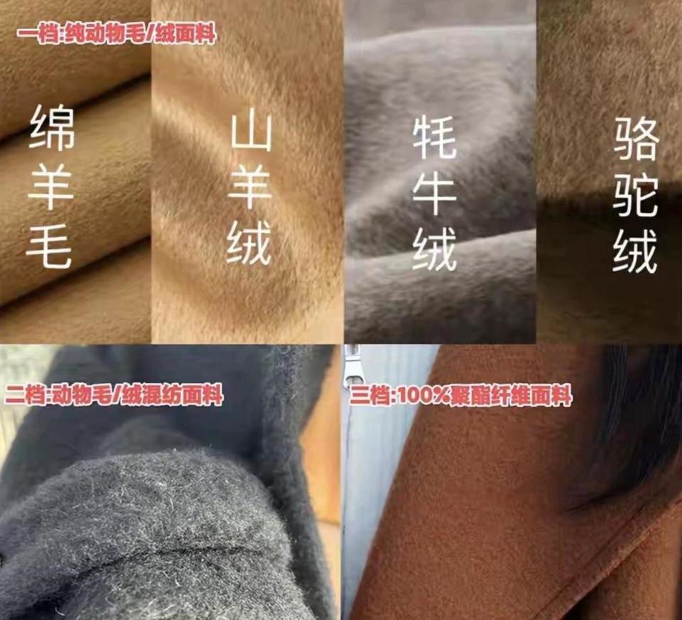 第一档:是纯动物毛,还有绒面料,咱们可以选择绵羊毛,山羊绒,牦牛绒,骆驼绒。