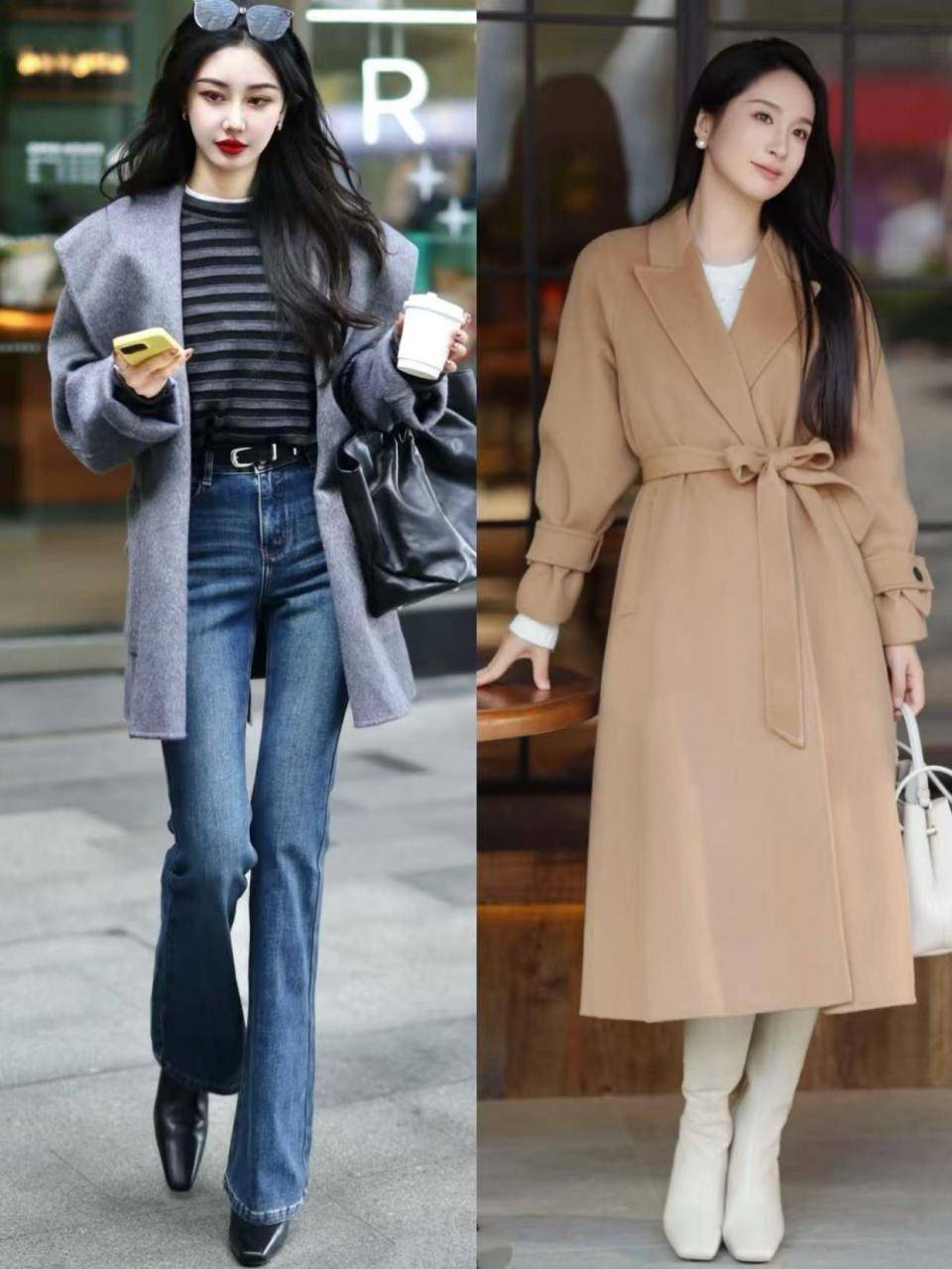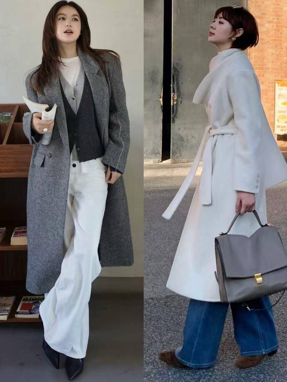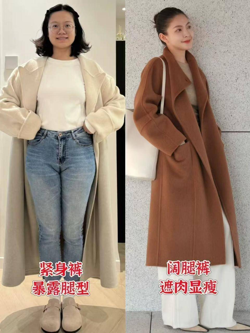咱们就看下面这两位穿搭对比就可以得出一个你心中想要的答案,如果你选择了一条紧身的牛仔裤,搭配上大衣外套,毫无疑问暴露你腿粗胯宽的,这些身材缺点,自然无法呈现出高级时尚的气质。