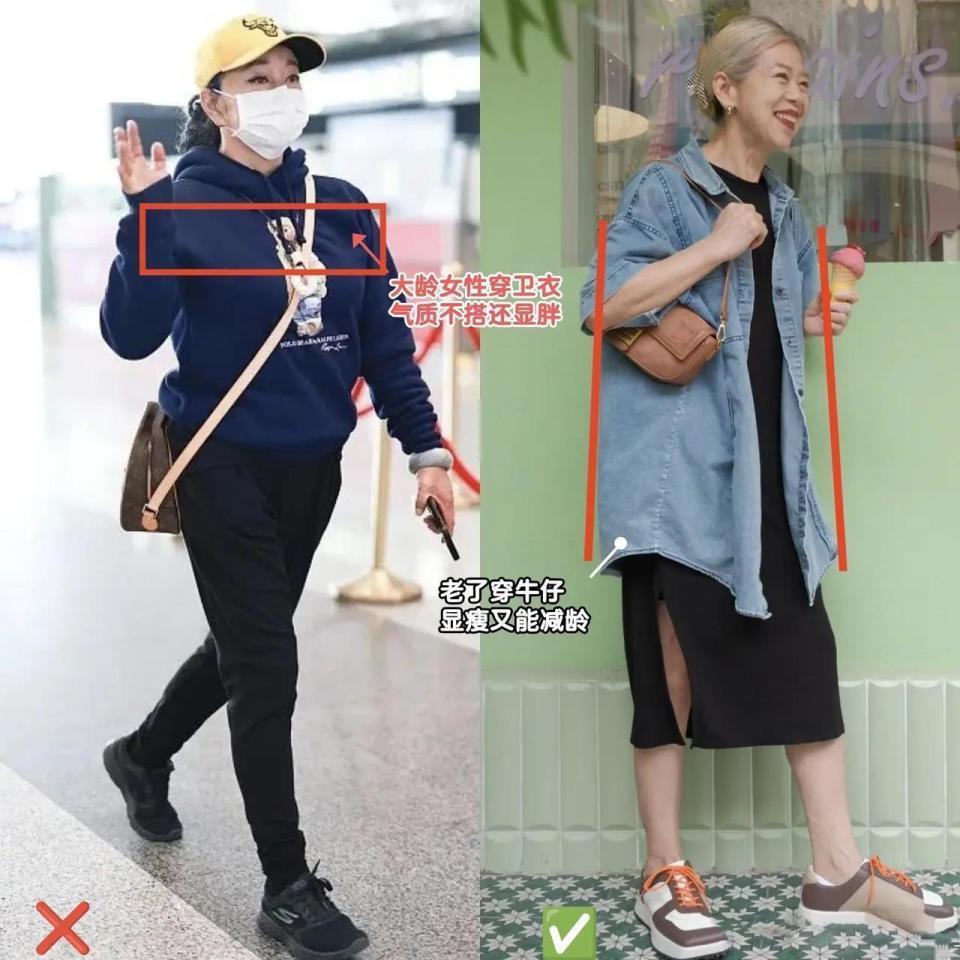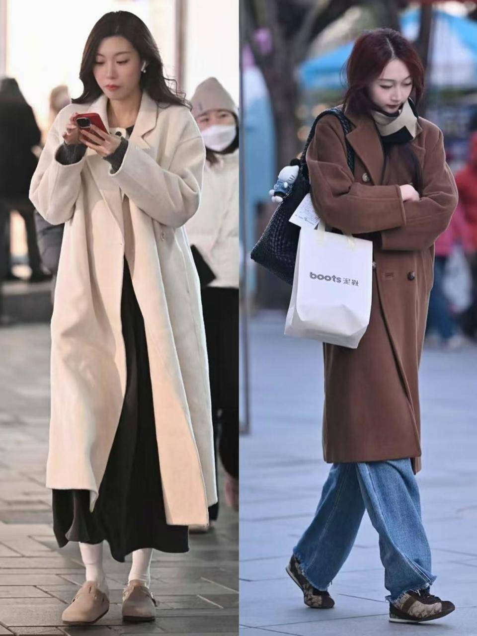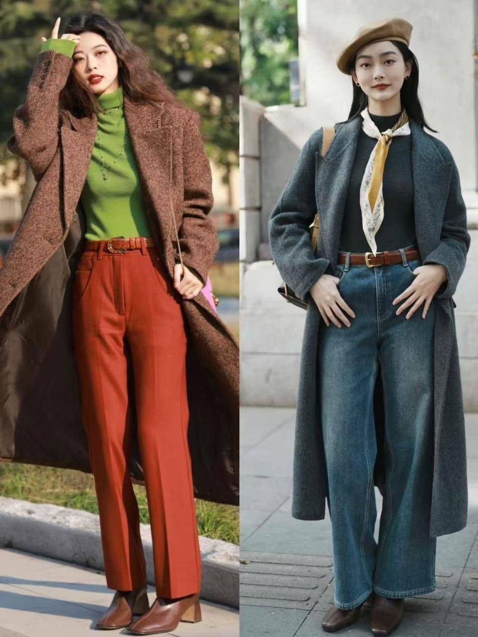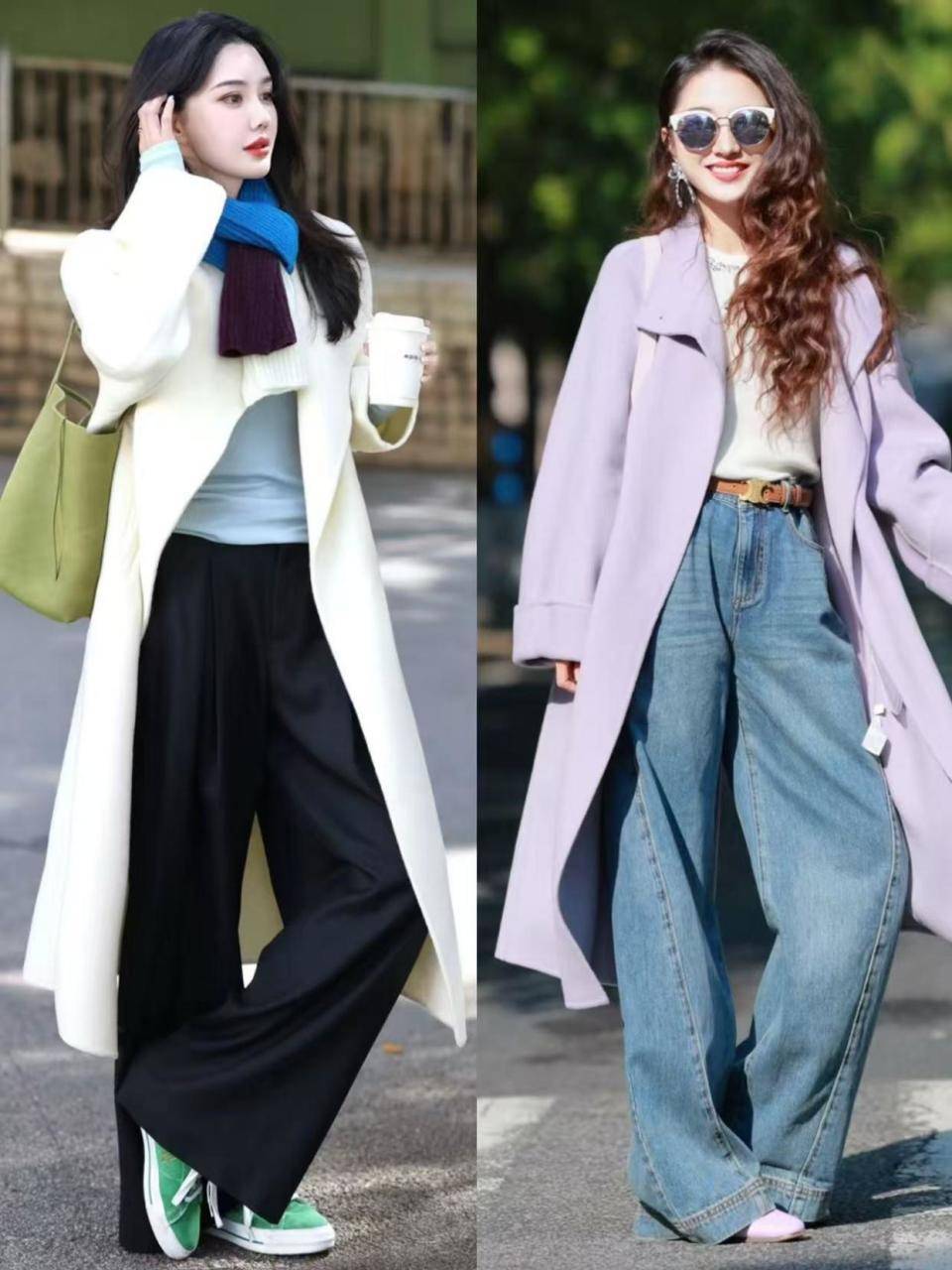 咱们就看下面这两位穿搭对比就可以得出一个你心中想要的答案,如果你选择了一条紧身的牛仔裤,搭配上大衣外套,毫无疑问暴露你腿粗胯宽的,这些身材缺点,自然无法呈现出高级时尚的气质。
