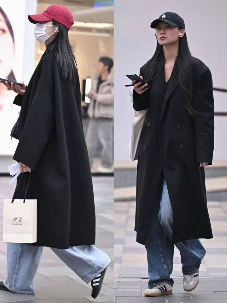 如果你的性格内敛,这时候我们可以直接选择最为基础的黑色大衣内搭黑色针织衫,加上一条蓝色的牛仔阔腿裤或者是直筒裤,脚上穿了一双德训鞋就够,想要呈现出运动风,可以加上一款红色或者是黑色的棒球帽,能使得你的造型变得更加休闲。
